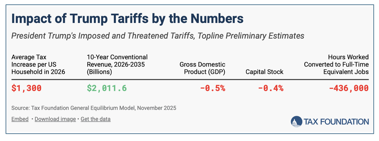 President Trump has imposed International Emergency Economic Powers Act (IEEPA) tariffs on US trading partners, including China, Canada, Mexico, and the EU. In addition, he has threatened and imposed Section 232 tariffs on autos, heavy trucks, steel, aluminum, lumber, furniture, semiconductors, pharmaceuticals, and copper, among others. The Trump tariffs amount to an average tax increase per US household of $1,000 in 2025 and $1,300 in 2026. Under the tariffs imposed and scheduled as of February 6, 2026, the weighted average applied tariff rate on all imports rises to 13.5 percent, and the average effective tariff rate, reflecting behavioral responses, rises to 9.9 percent—the highest average rate since 1946. The Trump tariffs are the largest US tax increase as a percent of GDP (0.54 percent for 2026) since 1993. Trump’s imposed tariffs will raise $2.0 trillion in revenue from 2026-2035 on a conventional basis and reduce US GDP by 0.5 percent, all before foreign retaliation. Accounting for negative economic effects, the revenue raised by the tariffs falls to $1.6 trillion over the next decade. We estimate that the tariffs raised $132 billion in net tax revenue in 2025. The Trump tariffs threaten to offset much of the economic benefits of the new tax cuts, while falling short of paying for them.